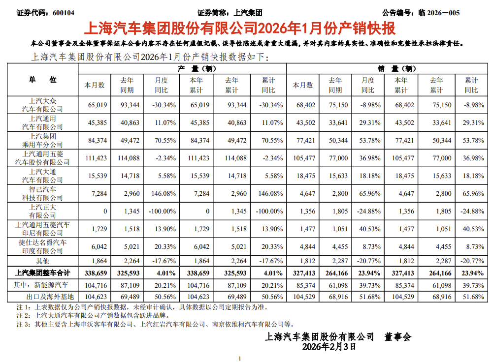 2026年1月产销核心数据概览 - 2026年1月,公司整车销量为327,413辆,同比增长23.94% [1] - 其中,新能源汽车销量为85,374辆,同比增长39.73% [1] - 出口及海外基地销量为104,529辆,同比增长51.68% [1] 主要合资及自主品牌产销表现 - **上汽大众**:本月销量68,402辆,同比下降8.98%;产量65,019辆,同比下降30.34% [2] - **上汽通用**:本月销量43,502辆,同比大幅增长29.31%;产量45,385辆,同比增长11.07% [2] - **上汽乘用车分公司**:本月销量77,421辆,同比大幅增长53.78%;产量84,374辆,同比大幅增长70.55% [2] - **上汽通用五菱**:本月销量105,477辆,同比增长36.98%;产量111,423辆,同比微降2.34% [2] - **上汽大通**:本月销量18,475辆,同比增长18.18%;产量15,539辆,同比增长5.58% [2] - **智己汽车**:本月销量4,647辆,同比大幅增长65.96%;产量7,284辆,同比大幅增长146.08% [2] 海外业务单元产销表现 - **上汽通用五菱印尼**:本月销量1,477辆,同比增长40.53%;产量1,729辆,同比增长13.90% [2] - **捷仕达名爵印度**:本月销量4,844辆,同比增长8.73%;产量6,042辆,同比增长20.33% [2] - **上汽正大**:本月销量1,356辆,同比下降24.88%;产量为0,去年同期为1,345辆 [2] 整体产量与细分结构 - 2026年1月,公司整车总产量为338,659辆,同比增长4.01% [2] - 新能源汽车产量为104,716辆,同比增长20.21% [2] - 出口及海外基地产量为104,623辆,同比增长50.56% [2]