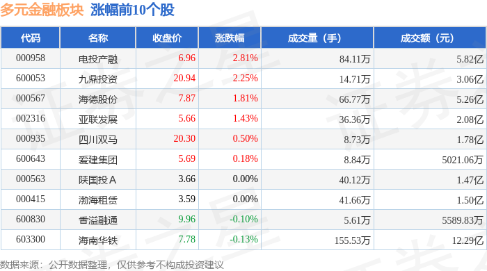 多元金融板块整体市场表现 - 2023年11月7日,多元金融板块整体下跌0.53%,表现弱于大盘,当日上证指数下跌0.25%至3997.56点,深证成指下跌0.36%至13404.06点 [1] - 板块内个股表现分化,电投产融领涨,涨幅为2.81%,收盘价6.96元,浙江东方领跌,跌幅为3.57%,收盘价6.76元 [1][2] 板块个股价格与成交情况 - 涨幅居前的个股包括电投产融(涨2.81%,收盘价6.96元,成交额5.82亿元)、九鼎投资(涨2.25%,收盘价20.94元,成交额3.06亿元)、海德股份(涨1.81%,收盘价7.87元,成交额5.26亿元) [1] - 跌幅居前的个股包括浙江东方(跌3.57%,收盘价6.76元,成交额9.77亿元)、弘明第(跌1.90%,收盘价10.83元,成交额1.04亿元)、*ST能猫(跌1.87%,收盘价66.6元,成交额6504.45万元) [2] - 部分个股成交活跃,如海南华铁成交额达12.29亿元,浙江东方成交额达9.77亿元,国网英大成交额达6.02亿元 [1][2] 板块资金流向分析 - 当日多元金融板块整体呈现主力资金净流出状态,净流出金额为4.3亿元,而游资资金净流入8425.13万元,散户资金净流入3.46亿元 [2] - 个股层面资金流向差异显著,电投产融获得主力资金净流入4981.88万元,主力净占比8.56%,九鼎投资获得主力资金净流入4004.64万元,主力净占比13.08% [3] - 部分个股遭遇主力资金流出,如*ST仁东主力净流出255.60万元,香溢融通主力净流出285.85万元 [3]