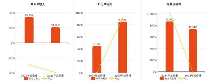 公司业绩表现 - 2025年前三季度营业总收入为59.88亿元,同比下降20.26% [1] - 2025年前三季度归属母公司股东净利润为8亿元,同比增长96.78% [1] - 2025年前三季度基本每股收益为0.24元 [1]