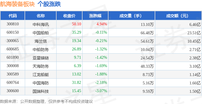 航海装备板块市场表现 - 板块整体下跌0.39%,表现弱于上证指数(上涨0.1%)和深证成指(下跌0.25%)[1] - 板块内9只成分股中仅1只上涨,8只下跌,领跌个股为国瑞科技,跌幅为3.07%[1] 个股价格与交易情况 - 中科海讯为板块内唯一上涨个股,涨幅4.94%,收盘价50.10元,成交额6.46亿元[1] - 中国船舶成交最为活跃,成交量66.48万手,成交额23.51亿元,股价微跌0.11%[1] - 国瑞科技跌幅最大为3.07%,收盘价15.45元,成交额1.50亿元[1] - 中船防务跌幅1.32%,成交额2.71亿元[1] 板块资金流向 - 航海装备板块整体主力资金净流出1.72亿元,游资资金净流入2337.01万元,散户资金净流入1.49亿元[1] - 中国船舶主力资金净流出金额最大,达4915.38万元,但散户资金净流入5754.71万元[2] - 中船防务主力资金净流出4171.55万元,主力净占比-15.36%,为占比最高[2] - 中科海讯主力资金净流入2508.78万元,是唯一获得主力资金净流入的个股[2]