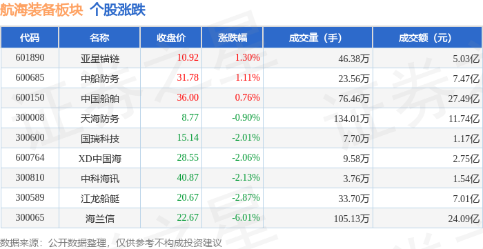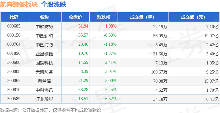 | 代码 | 名称 | 收盘价 | 涨跌幅 | 成交量(手) | 成交额(元) | | --- | --- | --- | --- | --- | --- | | 600764 | 中国海防 | 28.80 | 3.08% | 13.05万 | 3.74亿 | | 601890 | 亚星值链 | 10.91 | 2.25% | 36.08万 | 3.92亿 | | 300008 | 天海防务 | 8.65 | 1.88% | 107.41万 | 9.23亿 | | 600685 | 中船防务 | 31.60 | 1.61% | 20.27万 1 | 6.40亿 | | 600150 | 中国船舶 | 35.75 | 1.19% | 72.30万 | 25.76亿 | | 300600 | 園瑞科技 | 14.95 | 0.67% | 5.64万 | 8397.19万 | | 300065 | 海兰信 | 22.41 | 0.58% | 62.75万 | 14.05亿 | | 300589 | 江龙船艇 | 19.80 | 0.51% | 26.25万 | 5.20亿 | | 300810 | 中规海讯 | 4 ...