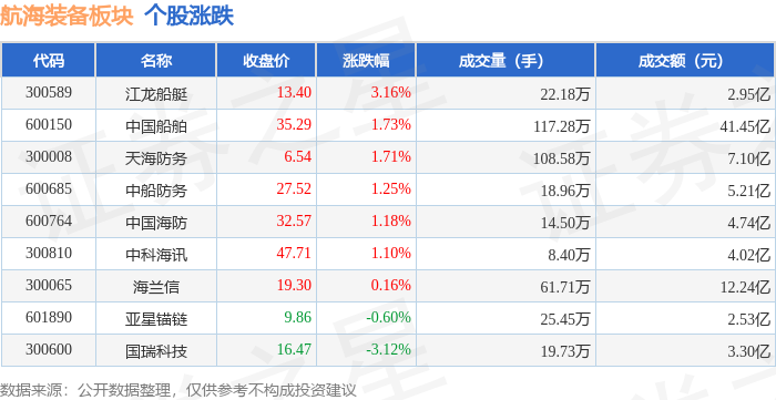 证券之星消息,10月14日航海装备板块较上一交易日上涨1.48%,江龙船艇领涨。当日上证指数报收于 3865.23,下跌0.62%。深证成指报收于12895.11,下跌2.54%。航海装备板块个股涨跌见下表: 从资金流向上来看,当日航海装备板块主力资金净流入4.34亿元,游资资金净流出2.23亿元,散户资金净 流出2.12亿元。航海装备板块个股资金流向见下表: | 代码 | 名称 | 主力净流入(元) | 主力净占比 游资净流入 (元) | | 游资净占比 散户净流入 (元) | | 散户净占比 | | --- | --- | --- | --- | --- | --- | --- | --- | | 600150 | 中国船舶 | 3.00ZZ | 7.24% | -1.66 Z | -4.01% | -1.34 Z | -3.23% | | 300008 天海防务 | | 7071.50万 | 9.97% | -979.02万 | -1.38% | -6092.48万 | -8.59% | | 600685 中船防务 | | 5357.79万 | 10.27% | -1059.84万 | -2.03% | ...
