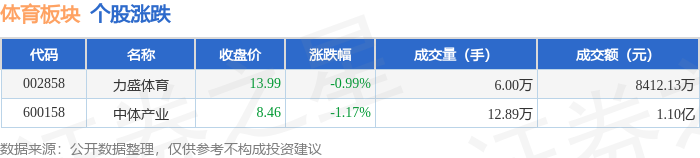 从资金流向上来看,当日体育板块主力资金净流出190.6万元,游资资金净流入1240.89万元,散户资金净 流出1050.29万元。体育板块个股资金流向见下表: 以上内容为证券之星据公开信息整理,由AI算法生成(网信算备310104345710301240019号),不构成投资建议。 证券之星消息,11月26日体育板块较上一交易日下跌1.13%,中体产业领跌。当日上证指数报收于 3864.18,下跌0.15%。深证成指报收于12907.83,上涨1.02%。体育板块个股涨跌见下表: | | | | 代码 名称 主力净流入(元) 主力净占比 游资净流入(元) 游资净占比 散户净占比 | | | | | --- | --- | --- | --- | --- | --- | --- | | 600158 中体产业 | -72.77万 | -0.66% | 479.69万 | 4.37% | -406.92万 | -3.71% | | 002858 力盛体育 | -117.82万 | -1.40% | 761.20万 | 9.05% | -643.37万 | -7.65% | | 代码 | 名称 | 收盘价 | 涨跌 ...