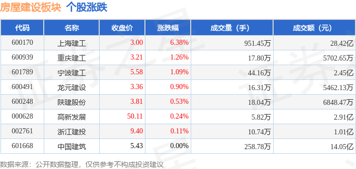 从资金流向上来看,当日房屋建设板块主力资金净流入3.41亿元,游资资金净流出4211.19万元,散户资 金净流出2.99亿元。房屋建设板块个股资金流向见下表: | 代码 | 名称 | 收盘价 | 涨跌幅 | 成交量(手) | 成交额(元) | | --- | --- | --- | --- | --- | --- | | 600170 | 上海建工 | 3.00 | 6.38% | 951.45万 | 28.42 Z | | 600939 | 重庆建工 | 3.21 | 1.26% | 17.80万 | 5702.65万 | | 601789 | 宁波建工 | 5.58 | 1.09% | 44.16万 | 2.45 Z | | 600491 | 龙元建设 | 3.36 | 0.90% | - 16.31万 | 5462.13万 | | 600248 | 陕建股份 | 3.81 | 0.53% | 18.04万 | 6848.47万 | | 000628 | 高新发展 | 50.11 | 0.24% | 5.82万 | 2.91亿 | | 002761 | 浙江建投 | 9.40 | 0.11% | 10.7 ...