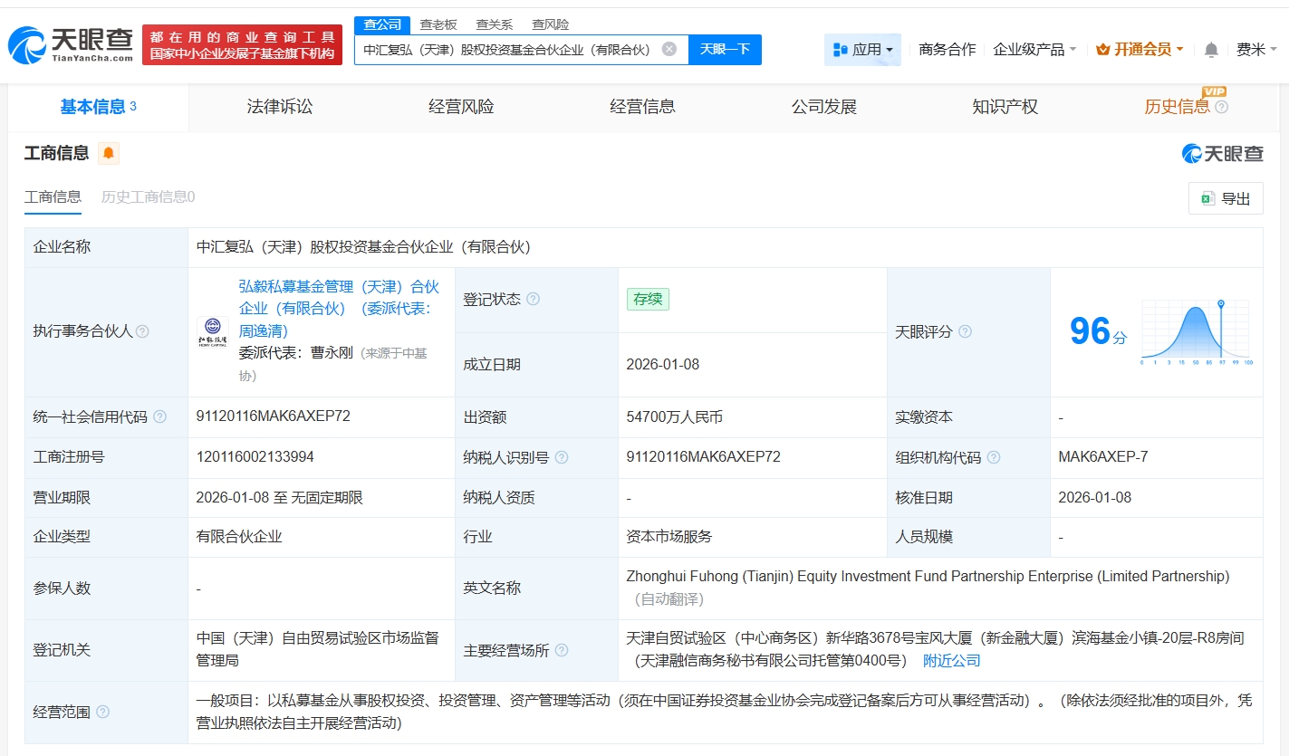 基金设立 - 中汇复弘(天津)股权投资基金合伙企业(有限合伙)于2026年1月8日成立,登记状态为存续,出资额为5.47亿人民币(54700万人民币)[1][2] - 该基金执行事务合伙人为弘毅私募基金管理(天津)合伙企业(有限合伙),委派代表为曹永刚[2] - 基金经营范围为以私募基金从事股权投资、投资管理、资产管理等活动,需在中国证券投资基金业协会完成登记备案后方可经营[1][2] 出资结构 - 基金由三方共同出资:中汇人寿保险股份有限公司、上海复星医药产业发展有限公司、弘毅私募基金管理(天津)合伙企业(有限合伙)[1][2] - 弘毅私募基金管理(天津)合伙企业(有限合伙)同时担任执行事务合伙人及基金管理人[1][2] 公司背景 - 基金注册于中国(天津)自由贸易试验区,主要经营场所位于天津自贸试验区(中心商务区)新华路3678号宝风大厦[2] - 公司类型为有限合伙企业,行业属于资本市场服务[2]