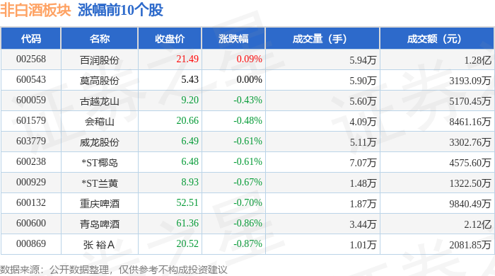 证券之星消息,12月29日非白酒板块较上一交易日下跌1.42%,惠泉啤酒领跌。当日上证指数报收于 3965.28,上涨0.04%。深证成指报收于13537.1,下跌0.49%。非白酒板块个股涨跌见下表: | 代码 | 名称 | 收盘价 | 涨跌幅 | 成交量(手) | | 成交额(元) | | --- | --- | --- | --- | --- | --- | --- | | 002568 | 百润股份 | 21.49 | 0.09% | | 5.94万 | 1.28亿 | | 600543 | 草高股份 | 5.43 | 0.00% | | 5.90万 | 3193.09万 | | 600059 | 古越龙山 | 9.20 | -0.43% | | 5.60万 | 5170.45万 | | 601579 | 会稽山 | 20.66 | -0.48% | | 4.09万 | 8461.16万 | | 603779 | 威龙股份 | 6.49 | -0.61% | | 5.11万 | 3302.76万 | | 600238 | *ST椰岛 | 6.48 | -0.61% | | 7.07万 | 4575.6 ...