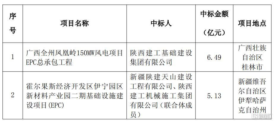 证券代码:600248 证券简称:陕建股份 公告编号:2025-078 陕西建工集团股份有限公司 重大项目中标公告 本公司董事会及全体董事保证本公告内容不存在任何虚假记载、误导性陈述 或者重大遗漏,并对其内容的真实性、准确性和完整性承担法律责任。 2025年9月,陕西建工集团股份有限公司下属子公司中标5亿元以上施工项目 情况如下: | 序 | 项目名称 | 中标人 | 中标金额 | 项目地点 | | --- | --- | --- | --- | --- | | 号 | | | (亿元) | | | 1 | 广西全州凤凰岭150MW风电项目 EPC总承包工程 | 陕西建工基础建设 集团有限公司 | 6.49 | 广西壮族 自治区 | | | | | | 桂林市 | | 2 | 霍尔果斯经济开发区伊宁园区 | 新疆陕建天山建设 工程有限公司、陕西 | | 新疆维吾 | | | | | | 尔自治区 | | | 新材料产业园二期基础设施建 | 建工机械施工集团 | 5.13 | 伊犁哈萨 | | | 设项目(EPC) | 有限公司(联合体成 | | | | | | | | 克自治州 | | | | 员) | | ...
