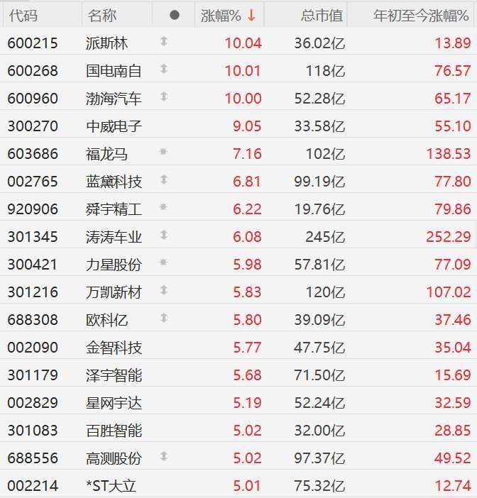 指数表现 - 中证全指电力设备指数上涨超过2% [1] 个股表现 - 新特电气股价涨停 [1] - 国电南自股价涨停 [1] - 四方股份股价涨停 [1] - 神马电力股价涨停 [1] - 海兴电力涨幅居前 [1] - 吉鑫科技涨幅居前 [1]