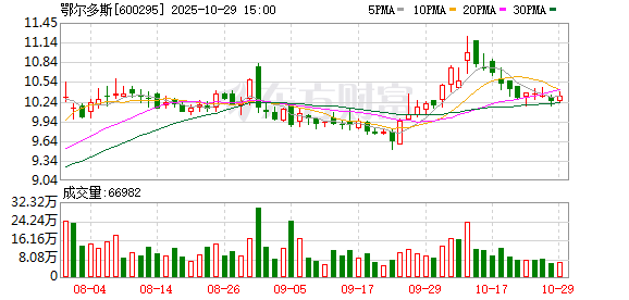 每经头条(nbdtoutiao)——A股突破4000点!十年沉寂终迎爆发,科技主线重塑市场,"慢牛"新格局开 启! (记者 曾健辉) 每经AI快讯,鄂尔多斯(SH 600295,收盘价:10.33元)10月29日晚间发布三季度业绩公告称,2025年 前三季度营收约182亿元,同比减少9.76%;归属于上市公司股东的净利润约17.06亿元,同比减少 0.85%;基本每股收益0.61元,同比增加0%。 截至发稿,鄂尔多斯市值为289亿元。 ...