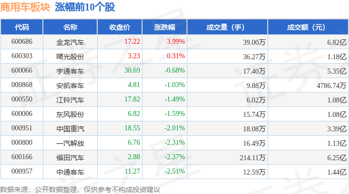 商用车板块市场表现 - 1月28日,商用车板块整体下跌0.27%,表现弱于大盘,当日上证指数上涨0.27%,深证成指上涨0.09% [1] - 板块内个股表现分化,中国重汽领涨,涨幅为3.71%,收盘价19.29元,成交额6.96亿元 [1] - 金龙汽车领跌,跌幅为5.29%,收盘价17.71元,成交额10.78亿元,成交量61.00万手 [1][2] 板块个股涨跌与交易情况 - 板块中上涨个股包括:中国重汽(涨3.71%)、江铃汽车(涨1.41%)、江淮汽车(涨0.76%)、福田汽车(涨0.32%) [1] - 板块中下跌个股包括:一汽解放(跌0.14%)、中通客车(跌0.93%)、东风股份(跌1.14%)、安凯客车(跌1.21%)、曙光股份(跌1.24%)、宇通客车(跌1.73%)、汉马科技(跌2.21%)、中集车辆(跌2.35%)、金龙汽车(跌5.29%) [1][2] - 成交量最大的个股为福田汽车,成交159.35万手,成交额5.02亿元 [1] - 成交额最大的个股为江淮汽车,成交额28.59亿元,成交量53.91万手 [1] 板块资金流向 - 当日商用车板块整体呈现主力资金和游资净流出,散户资金净流入,主力资金净流出7318.92万元,游资资金净流出1.57亿元,散户资金净流入2.30亿元 [2] - 江淮汽车获得主力资金净流入1.96亿元,主力净占比6.86%,但同时游资净流出1.45亿元 [3] - 江铃汽车、宇通客车、曙光股份也获得主力资金净流入,分别为772.51万元、732.82万元、706.78万元 [3] - 主力资金净流出较多的个股包括:东风股份(净流出2293.47万元)、中通客车(净流出1658.25万元)、汉马科技(净流出1340.51万元)、安凯客车(净流出826.12万元)、中集车辆(净流出804.69万元) [3]