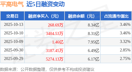 平高电气:10月13日融资净买入268.69万元,连续3日累计净买入1.83亿元