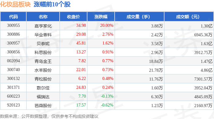 证券之星消息,10月9日化妆品板块较上一交易日下跌0.53%,上海家化领跌。当日上证指数报收于 3933.97,上涨1.32%。深证成指报收于13725.56,上涨1.47%。化妆品板块个股涨跌见下表: 以上内容为证券之星据公开信息整理,由AI算法生成(网信算备310104345710301240019号),不构成投资建议。 | 代码 | 名称 | 收盘价 | 涨跌幅 | 成交量(手) | 成交额(元) | | --- | --- | --- | --- | --- | --- | | 300955 | 嘉亨家化 | 34.98 | 20.00% | 3.88万 | 1.30亿 | | 300886 | 华 香料 | 29.08 | 2.76% | 2.42万 | 6945.36万 | | 300957 | 贝泰妮 | 45.81 | 1.62% | 3.58万 | 1.63亿 | | 300856 | 科思股份 | 13.27 | 0.91% | 2.96万 | 3912.75万 | | 002094 | 青岛金王 | 7.82 | 0.77% | 18.84万 | 1.47亿 | | 300740 | 水 ...