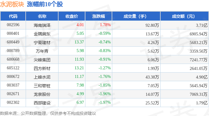 水泥板块市场表现 - 10月16日水泥板块整体下跌2.52%,领跌个股为西藏天路[1] - 当日上证指数报收于3916.23点,上涨0.1%,深证成指报收于13086.41点,下跌0.25%,显示水泥板块表现弱于大盘[1] - 板块内个股普遍下跌,跌幅居前的包括西部建设(下跌1.97%)、龙泉股份(下跌1.96%)和三和管桩(下跌1.85%)[1] 个股交易情况 - 海南瑞泽为板块中少数上涨个股,收盘上涨1.78%,成交量为92.80万手,成交额达3.71亿元[1] - 上峰水泥成交量最大,为43.38万手,成交额为4.90亿元,但股价下跌1.76%[1] - 金隅集团(冀东水泥)成交量为13.67万手,成交额为6905.94万元,股价微跌0.59%[1] 板块资金流向 - 水泥板块整体呈现主力资金净流出7.1亿元,而游资和散户资金分别净流入4669.4万元和6.63亿元[2] - 海南瑞泽获得主力资金净流入2083.13万元,主力净占比为5.62%,同时游资净流入1512.98万元[2] - 三和管桩主力资金净流出幅度最大,达670.11万元,主力净占比为-11.87%[2] - 宁夏建材和尖峰集团分别获得主力资金净流入505.15万元和311.98万元,主力净占比分别为8.89%和4.31%[2]