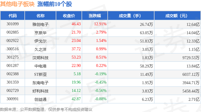 证券之星消息,10月14日其他电子板块较上一交易日下跌3.4%,旭光电子领跌。当日上证指数报收于 3865.23,下跌0.62%。深证成指报收于12895.11,下跌2.54%。其他电子板块个股涨跌见下表: | 代码 | 名称 | 收盘价 | 涨跌幅 | 成交量(手) | 成交额(元) | | | --- | --- | --- | --- | --- | --- | --- | | 660106 | 雅创电子 | 46.43 | 12.91% | 26.74万 | | 12.64亿 | | 002885 | 京泉华 | 21.70 | 2.79% | 63.05万 | | 14.04亿 | | 002922 | 伊戈尔 | 23.04 | 1.54% | 51.83万 | | 12.33亿 | | 300516 | 久之洋 | 37.72 | 0.99% | - 3.05万 | | 1.15亿 | | 301275 | 汉朔科技 | 53.23 | 0.51% | 1.83万 | | 9729.53万 | | 001287 | 中電港 | 22.90 | 0.22% | 58.29万 | | 13.84亿 ...