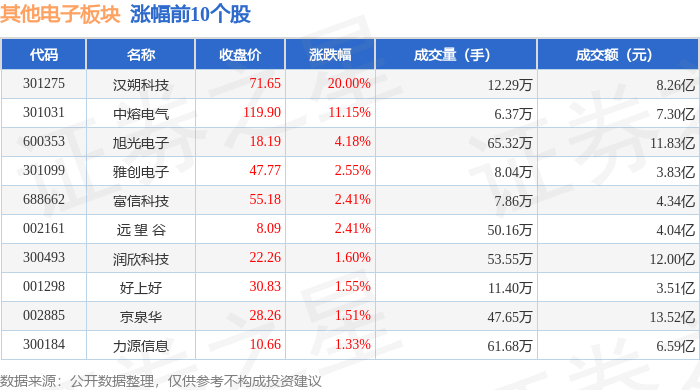 从资金流向上来看,当日其他电子板块主力资金净流出9.61亿元,游资资金净流入2.04亿元,散户资金净 流入7.56亿元。其他电子板块个股资金流向见下表: 证券之星消息,1月14日其他电子板块较上一交易日上涨0.57%,汉朔科技领涨。当日上证指数报收于 4126.09,下跌0.31%。深证成指报收于14248.6,上涨0.56%。其他电子板块个股涨跌见下表: | 代码 | 名称 | 收盘价 | 涨跌幅 | 成交量(手) | | 成交额(元) | | --- | --- | --- | --- | --- | --- | --- | | 301275 | 汉朔科技 | 71.65 | 20.00% | | 12.29万 | 8.26亿 | | 301031 | 中熔电气 | 119.90 | 11.15% | | 6.37万 | 7.30亿 | | 600353 | 旭光电子 | 18.19 | 4.18% | | 65.32万 | 11.83 乙 | | 301099 | 雅创电子 | 47.77 | 2.55% | | 8.04万 | 3.83亿 | | 688662 | 富信科技 | 55.18 | 2.4 ...
