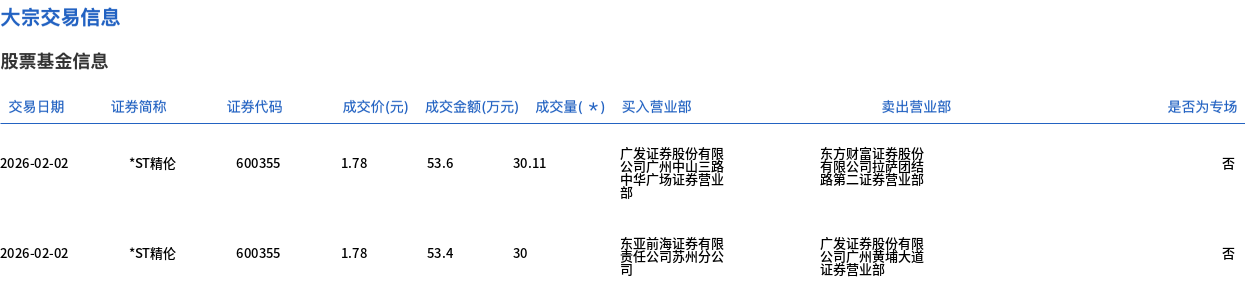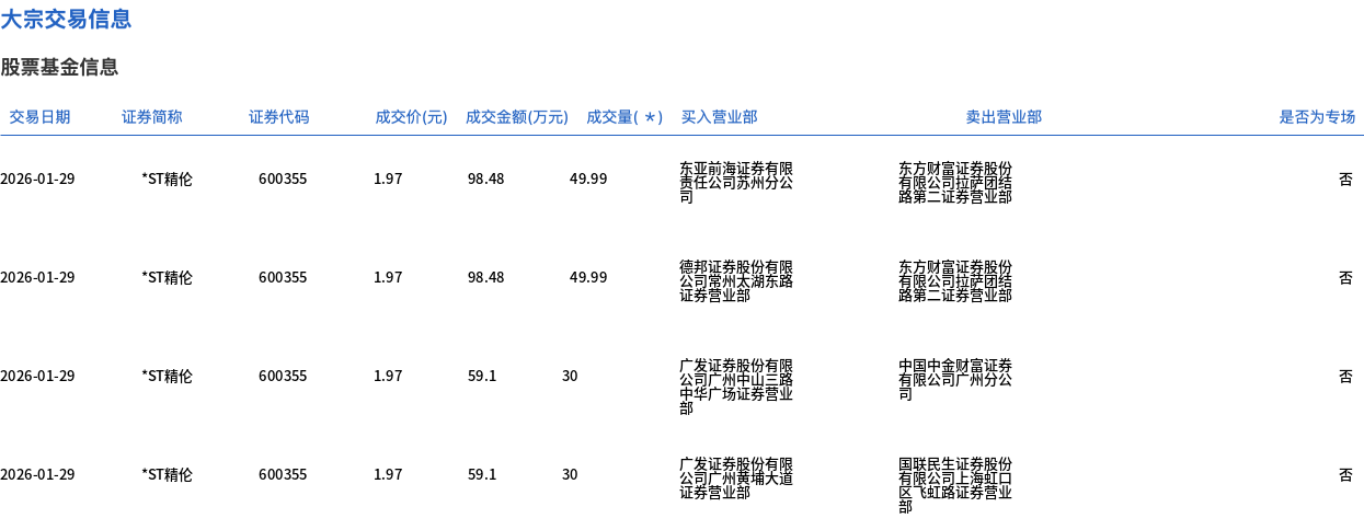| 交易日期 | 证券简称 | 证券代码 | | | 成交价(元) 成交金额(万元) 成交量(*) 买入营业部 | | | 卖出营业部 | | --- | --- | --- | --- | --- | --- | --- | --- | --- | | 2026-01-29 | *ST精伦 | 600355 | 1.97 | 98.48 | 49.99 | 第41章 在线官网 | | | | 2026-01-29 | *ST精伦 | 600352 | 1.97 | 98.48 | 49.99 | 公司堂和关键军致 | | | | 2026-01-29 | *ST精伦 | ୧୦୦352 | 1.97 | 59.1 | 30 | 公告 | 这份量限 | | | 2026-01-29 | *ST精伦 | 600355 | 1.97 | 59.1 | 30 | | 高感喜感 | | 1月29日,*ST精伦大宗交易成交159.98万股,成交额315.16万元,占当日总成交额的17.94%,成交价1.97元,较市场收盘价1.97元持平。 ...