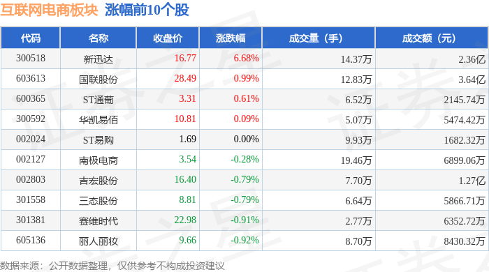 证券之星消息,11月7日互联网电商板块较上一交易日下跌0.8%,青木科技领跌。当日上证指数报收于 3997.56,下跌0.25%。深证成指报收于13404.06,下跌0.36%。互联网电商板块个股涨跌见下表: | 代码 | 名称 | 收盘价 | 涨跌幅 | 成交量(手) | 成交额(元) | | | --- | --- | --- | --- | --- | --- | --- | | 300518 | 新迅达 | 16.77 | 6.68% | 14.37万 | | 2.36亿 | | 603613 | 国联股份 | 28.49 | 0.99% | 12.83万 | | 3.64亿 | | 600365 | ST通葡 | 3.31 | 0.61% | 6.52万 | 2145.74万 | | | 300592 | 华凯易佰 | 10.81 | 0.09% | 5.07万 | 5474.42万 | | | 002024 | ST易购 | 1.69 | 0.00% | 9.93万 | 1682.32万 | | | 002127 | 南极电商 | 3.54 | -0.28% | 19.46万 | 6899.06万 ...