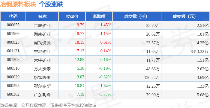 | 代码 | 名称 | 主力净流入(元) | 主力净占比 游资净流入 (元) | | 游资净占比 散户净流入 (元) | | 散户净占比 | | --- | --- | --- | --- | --- | --- | --- | --- | | 000923 河钢资源 | | 1124.32万 | 2.65% | -673.36万 | -1.58% | -450.97万 | -1.06% | | 600382 广东明珠 | | 849.14万 | 1.49% | 3262.28万 | 5.74% | -4111.42万 | -7.24% | | 601121 | 宝地矿业 | 45.40万 | 0.55% | -446.65万 | -5.37% | - 401.24万 | 4.83% | | 001203 大中矿业 | | -89.68万 | -0.59% | -543.02万 | -3.59% | 632.70万 | 4.18% | | 600295 鄂尔多斯 | | -115.18万 | -0.87% | 487.06万 | 3.66% | -371.88万 | -2.79% | | 601963 | 海 ...
