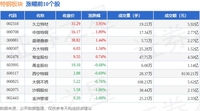 从资金流向上来看,当日特钢板块主力资金净流出2.26亿元,游资资金净流入5057.81万元,散户资金净 流入1.76亿元。特钢板块个股资金流向见下表: 证券之星消息,1月20日特钢板块较上一交易日上涨0.76%,久立特材领涨。当日上证指数报收于 4113.65,下跌0.01%。深证成指报收于14155.63,下跌0.97%。特钢板块个股涨跌见下表: | 代码 | 名称 | 收盘价 | 涨跌幅 | 成交量(手) | | 成交额(元) | | | --- | --- | --- | --- | --- | --- | --- | --- | | 002318 | 久立特材 | 31.29 | 3.95% | | 19.22万 | | 5.92亿 | | 000708 | 中信特钢 | 16.17 | 1.89% | | 17.34万 | | 2.77亿 | | 300881 | 盛德整泰 | 38.82 | 1.44% | | 5.72万 | 1 | 2.27亿 | | 600507 | 方大特钢 | 6.03 | 1.34% | 1 | 25.28万 | | 1.52亿 | | 002478 | 常宝股份 | ...