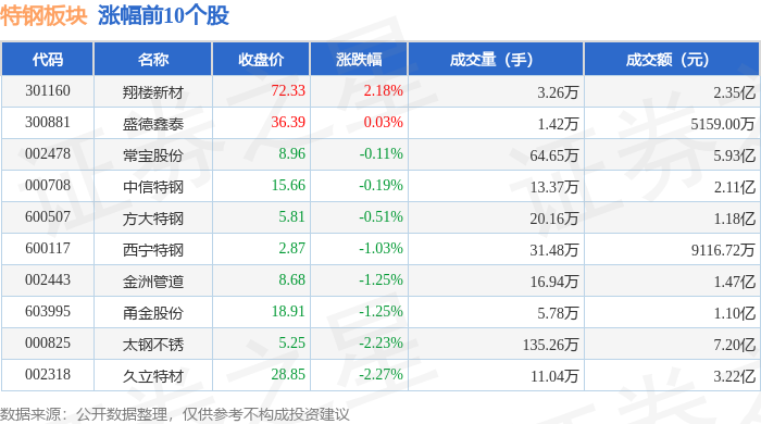 证券之星消息,1月19日特钢板块较上一交易日上涨1.74%,金洲管道领涨。当日上证指数报收于 4114.0,上涨0.29%。深证成指报收于14294.05,上涨0.09%。特钢板块个股涨跌见下表: | 代码 | 名称 | 收盘价 | 涨跌幅 | 成交量(手) | 成交额(元) | | | --- | --- | --- | --- | --- | --- | --- | | 002443 | 金州营道 | 9.35 | 7.72% | 45.19万 | | 4.17亿 | | 002478 | 常宝股份 | 9.48 | 5.80% | 63.63万 | | 6.01亿 | | 300881 | 盛德整泰 | 38.27 | 5.17% | 4.50万 | | 1.71亿 | | 002318 | 久立特材 | 30.10 | 4.33% | 15.93万 | | 4.76亿 | | 600507 | 方大特钢 | 5.95 | 2.41% | 27.32万 | | 1.61亿 | | 603995 | 角金股份 | 19.23 | 1.69% | 6.01万 | | 1.15亿 | | 000708 | 中 ...
