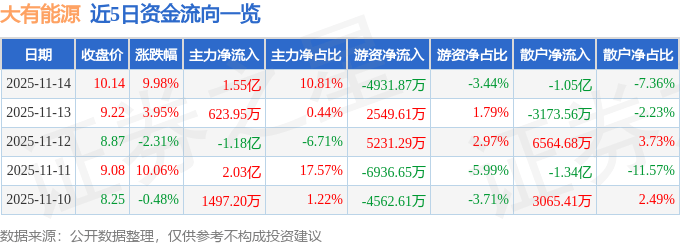 | | | | 日期 收盘价 涨跌幅 主力净流入 主力净占比 游资净街入 游资净占比 散户净拓入 散户净占比 | | | | | | --- | --- | --- | --- | --- | --- | --- | --- | | 2025-11-14 | 10.14 9.98% | 1.55 Z | 10.81% | -4931.87万 | -3.44% | -1.05亿 | -7.36% | | 2025-11-13 | 9.22 3.95% | 1 623.95万 | 0.44% | 2549.61万 | 1.79% | -3173.56万 | -2.23% | | 2025-11-12 | 8.87 -2.31% | -1.18亿 | -6.71% | 5231.29万 | | 2.97% 6564.68万 | 3.73% | | 2025-11-11 | 9.08 10.06% | 2.03亿 | 17.57% | -6936.65万 | -5.99% | -1.34亿 | -11.57% | | 2025-11-10 | 8.25 -0.48% | 1497.20万 | 1.22% | -456 ...