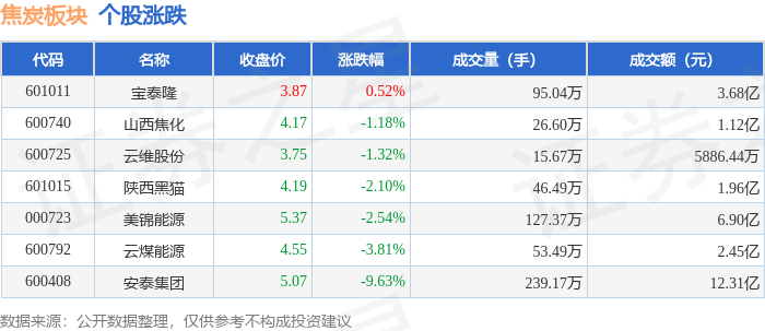 证券之星消息,11月20日焦炭板块较上一交易日下跌2.54%,安泰集团领跌。当日上证指数报收于 3931.05,下跌0.4%。深证成指报收于12980.82,下跌0.76%。焦炭板块个股涨跌见下表: | 代码 | 名称 | 收盘价 | 涨跌幅 | 成交量(手) | 成交额(元) | | | --- | --- | --- | --- | --- | --- | --- | | 601011 | 宝泰隆 | 3.87 | 0.52% | 95.04万 | | 3.68 Z | | 600740 | 山西焦化 | 4.17 | -1.18% | 26.60万 | | 1.12亿 | | 600725 | 云维股份 | 3.75 | -1.32% | 15.67万 | | 5886.44万 | | 601015 | 陕西黑猫 | 4.19 | -2.10% | 46.49万 | | 1.96 | | 000723 | 美锦能源 | 5.37 | -2.54% | 127.37万 | | 6.90亿 | | 600792 | 云煤能源 | 4.55 | -3.81% | 53.49万 | | 2.45亿 | | 60 ...