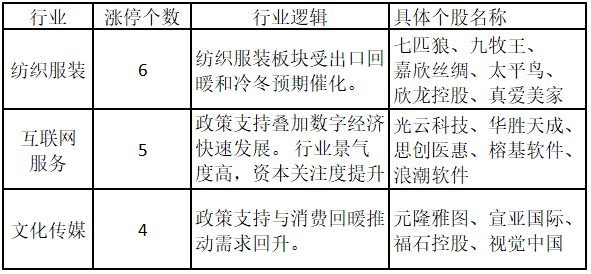 每经记者|闫峰峰 每经编辑|何建川 各位投资者,大家好。 | 行业 | 涨停个数 | 行业逻辑 | 具体个股名称 | | --- | --- | --- | --- | | 纺织服装 | 6 | 纺织服装板块受出口回 暖和冷冬预期催化。 | 七匹狼、九牧王、 嘉欣丝绸、太平鸟、 | | | | | 欣龙控股、真爱美家 | | 互联网 | 5 | 政策支持叠加数字经济 光云科技、华胜天成、 快速发展。 行业景气 | 思创医惠、榕基软件、 | | 服务 | | 度高,资本关注度提升 浪潮软件 | | | 文化传媒 | 4 | 政策支持与消费回暖推 元隆雅图、宣亚国际、 | | | | | 动需求回升。 | 福石控股、视觉中国 | 从行业特征来看,今日涨停板个股中,纺织服装、互联网服务、文化传媒行业的个股最多。 (注:行业涨停板个股越多,说明该行业被资金重点关注,是当前热门行业。) 从概念特征来看,今日涨停板个股中,人工智能大模型、大消费、福建自贸/海西概念的个股最多。 涨跌停板数据,不仅是反映板块和个股强弱的重要指标,更是体现市场情绪与资金流向的重要参考依 据。那么,今日的涨停个股有哪些特点呢?哪些涨停股又值得重 ...