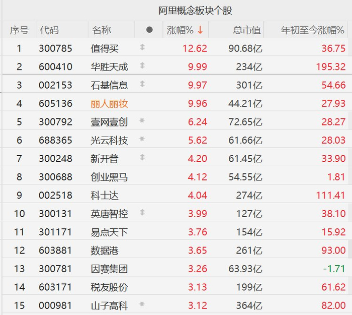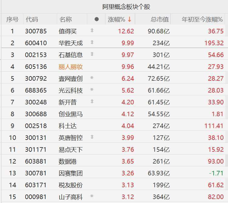 A股阿里概念股走强,值得买涨超12%,华胜天成、石基信息、丽人丽妆涨停,壹网壹创涨超6%,阿里全力进军AI to C市场