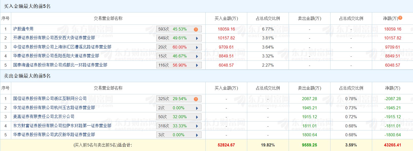 | 序号 | 交易营业部名称 | | 买入金额(万) | 占息成交比例 | | --- | --- | --- | --- | --- | | 1 | 国信证券股份有限公司浙江互联网分公司 | 325次 29.54% 2 | | | | 2 | 华龙证券股份有限公司杭州玉古路证券营业部 | 2次 0.00% | | | | 3 | 麦高证券有限责任公司北京分公司 | 50次 32.00% | | | | র্ব | 东方财富证券股份有限公司拉萨东环路第一证券营业部 | 318次 33.33% | | | | 5 | 华泰证券股份有限公司武汉新华路证券营业部 | 3次 0.00% | | | | | (买入前5名与卖出前5名)总合计: | | 52824.67 | 19.82% | 格隆汇11月17日|华胜天成(600410.SH)今日涨停,换手率12.68%,成交额26.66亿元。龙虎榜数据显示,沪股通位列买一席位,买入1.81亿元;"量化打 板"位列买二、买三席位,买入1.99亿元;"成都系"位列买五席位,买入6049万元。上榜席位全天买入5.28亿元,卖出9559万元,合计净买入4.33亿元。(格隆 汇) ...