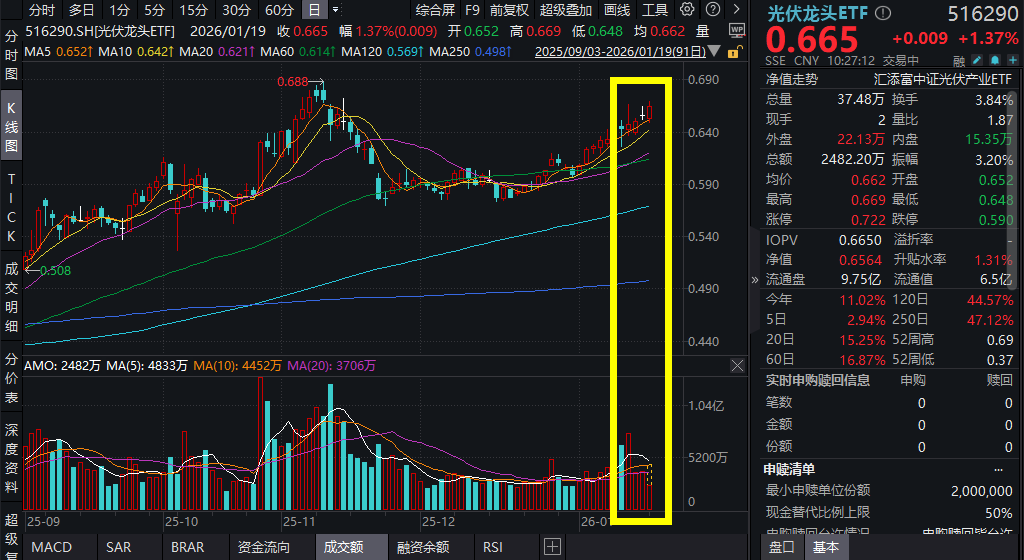 1月19日,A股市场震荡上行,沪指冲高回落在平盘附近震荡,同类费率最低档的光伏龙头ETF(516290)爆量涨1.37%,成交额超3000万元,冲 击日线四连阳! 光伏龙头ETF(516290)标的指数成分股涨跌不一,特变电工涨超7%,迈为股份、正泰电气涨超5%,TCL科技等涨超2%,隆基绿能、捷佳伟创 等回调。 | 【光伏龙头ETF(516290)标的指数前十大成分股】 | | --- | | 序号 | 代码 | 名称 | 申万一级行业 | 涨跌幅 | 估自权重 | | --- | --- | --- | --- | --- | --- | | 1 | 600089 | 特变电工 | 电力设备 | 7.07% | 11.13% | | 2 | 601012 | 陸其绿能 | 电力设备 | -2.24% | 8.94% | | 3 | 000100 | TCL科技 | 电子 | 2.90% | 7.98% | | 4 | 300274 | 阳光电源 | 电力设备 | 1.40% | 7.77% | | 5 | 600438 | 通威胎份 | 电力设备 | -3.95% | 4.25% | | 6 | 3007 ...