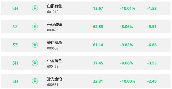 1月30日,黄金概念股多数低开。白银有色、兴业银锡、豫光金铅、中金黄金、盛达资源等多股跌停 价开盘。 | ટાન | | 白银有色 | 13.67 | -10.01% | -1.52 | | --- | --- | --- | --- | --- | --- | | | | 601212 | | | | | SZ | | 兴业银锡 | 62.85 | -8.06% | -5.51 | | | | 000426 | | | | | SZ | + | 盛达资源 | 61.14 | -9.82% | -6.66 | | | | 000603 | | | | | SH | + | 中金黄金 | 37.45 | -8.66% | -3.55 | | | | 600489 | | | | | SH | + | 豫米金铅 | 22.31 | -10.00% | -2.48 | | | | 600531 | | | | ...
