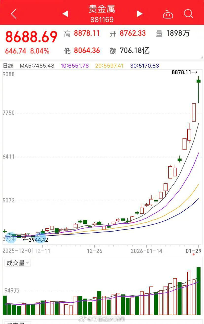A股贵金属板块年内翻倍,现货黄金首破5500美元