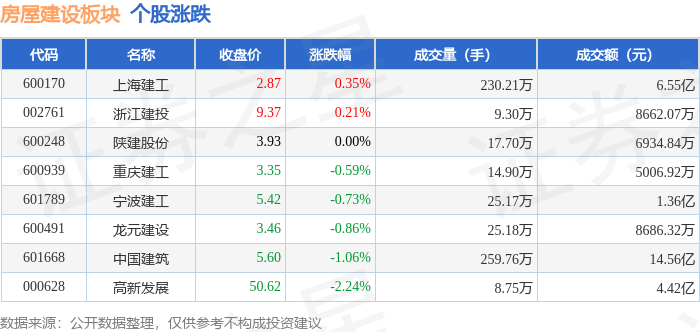 | 代码 | 名称 | 收盘价 | 涨跌幅 | 成交量(手) | 成交额(元) | | --- | --- | --- | --- | --- | --- | | 000628 | 高新发展 | 51.08 | 0.95% | 9.04万 | 4.61亿 | | 601668 | 中国建筑 | 5.74 | 0.53% | 248.82万 | 14.28亿 | | 66009 | 重庆建工 | 3.41 | 0.00% | 10.94万 | 3706.80万 | | 002761 | 浙江建投 | 9.40 | -0.11% | - 10.23万 | 9608.08万 | | 600248 | 陕建股份 | 3.95 | -0.25% | 18.26万 | 7217.20万 | | 601789 | 宁波建工 | 5.44 | -0.37% | 28.92万 | 1.58亿 | | 600170 | 上海建工 | 2.89 | -0.69% | 258.07万 | 7.49亿 | | 600491 | 龙元建设 | 3.55 | -1.93% | 34.98万 | 1.25亿 | | 代码 名称 | | 主力 ...