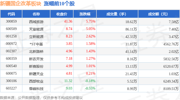 板块整体表现 - 新疆国企改革板块在11月4日整体下跌0.37%,表现弱于上证指数(下跌0.41%)但强于深证成指(下跌1.71%)[1] - 板块内个股表现分化,10只个股上涨,10只个股下跌,其中西部黄金领跌,跌幅为3.54%[1][2] - 西域旅游和天富能源领涨,涨幅分别为5.75%和5.05%[1] 个股价格与成交 - 西域旅游收盘价为41.36元,成交量为18.62万手,成交额达7.58亿元,为涨幅最大个股[1] - 天富能源收盘价为8.74元,成交量为86.11万手,成交额为7.40亿元,成交量居板块之首[1] - 西部黄金收盘价为26.45元,跌幅为3.54%,成交量为14.89万手,成交额为3.96亿元[2] - 新疆交建跌幅为2.00%,成交量为40.13万手,成交额为7.24亿元[2] 资金流向 - 新疆国企改革板块整体主力资金净流出2410.24万元,而游资和散户资金分别净流入30.08万元和2380.15万元[2] - 天富能源获得主力资金净流入8732.53万元,主力净占比达11.80%,但游资和散户资金呈净流出状态[3] - 西域旅游获得主力资金净流入6284.67万元,主力净占比为8.29%,同时游资净流入1869.49万元[3] - 北新路桥主力资金净流入2631.49万元,主力净占比高达13.04%[3] - 宝地矿业主力资金净流出334.90万元,散户资金净流入658.70万元,散户净占比为8.36%[3]