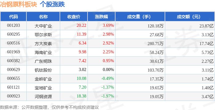 | 代码 | 名称 | 收盘价 | 涨跌幅 | 成交量(手) | 成交额(元) | | --- | --- | --- | --- | --- | --- | | 001203 | 大中矿业 | 20.22 | 3.69% | 120.18万 | 23.87 Z | | 600295 | 鄂尔多斯 | 11.39 | 2.98% | 27.68万 | 3.13亿 | | 600516 | 方大炭素 | 6.34 | 2.92% | 280.75万 | 17.74亿 | | 696109 | 一六是慰典 | 9.98 | 2.25% | 58.24万 | 5.73亿 | | 600382 | 广东明珠 | 7.42 | 0.95% | 30.61万 | 2.27亿 | | 000629 | 钢钛股份 | 3.02 | 0.00% | 103.70万 | 3.11亿 | | 000655 | 等龄矿业 | 10.08 | -0.49% | 17.35万 | 1.74亿 | | 601121 | 宝地矿业 | 7.20 | -1.37% | 19.65万 | 1.40 乙 | | 000923 | 河钢资源 | + ...