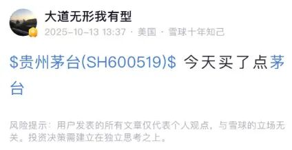 今年以来,受白酒消费不佳的影响,以贵州茅台为代表的一批白酒股,股价一直"跌跌不休"。 不过,段永平并不认同这种悲观情绪。他认为:"跟不喝贵州茅台也不认识喝贵州茅台的人聊贵州茅 台,是不是件很怪异的事情?喝酒有害健康、年轻人不喝贵州茅台、禁酒令……这些理由听上去都挺有 道理,但你真觉得有人能copy贵州茅台吗?有人能copy可口可乐吗?" 早在6月30日,贵州茅台于上一个交易日下跌1.13%后,段永平便发文鼓励贵州茅台投资者:"大家在害 怕什么呢?有点意思!" 值得注意的是,有投资人表示,可以等贵州茅台到1000以下买。对此,段永平表示,"到1400你也没 买,到1000你也不会买的。因为到了1000的时候,看着就像要到500的样子。看不懂公司炒股票是件很 折磨人的事情吧?" 在段永平看来,贵州茅台的核心价值是品牌壁垒与文化稀缺性。正如可口可乐之于全球软饮市场,贵州 茅台在中国白酒领域拥有独一无二的品牌资产与社会认同。在他眼中,贵州茅台的价值从未因为市场起 伏而改变。 白酒消费仍在探底 10月13日,知名投资人段永平在社交平台上再次发声,"今天买了点茅台!"短短一句话,再次引发市场 热议。 值得注意的是,从刚刚 ...