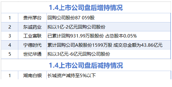 | | | 1.4上市公司盘后增持情况 | | --- | --- | --- | | 1 | 贵州茅台 | 回购公司股份87 059股 | | 2 | 东诚药业 | 拟以1亿-2亿元回购公司股份 | | 3 | 工业富联 | 已累计回购931.99万股股份 占总股本0.05% | | 4 | 宁德时代 | 累计回购公司A股股份1599万股 成交总金额为43.86亿元 | | 5 | 世纪华通 | 拟以3亿元-6亿元回购公司股份 | | | | 1.4上市公司盘后减得情况 | | 1 | 湖南白银 | 长城资产减持至5%以下 | 据统计,2026年1月4日,贵州茅台、东诚药业、工业富联、宁德时代、世纪华通披露增持情况。湖南白 银披露减持情况。 ...