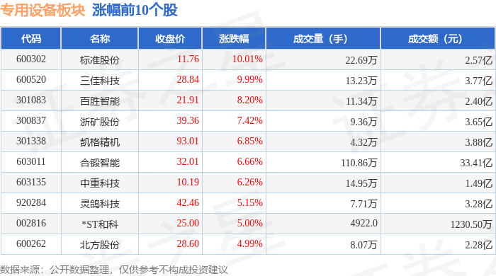 | 代码 | 名称 | 收盘价 | 涨跌幅 | 成交量(手) | 成交额(元) | | | --- | --- | --- | --- | --- | --- | --- | | 600302 | 标准股份 | 11.76 | 10.01% | 22.69万 | | 2.57亿 | | 600520 | 三佳科技 | 28.84 | 9.99% | 13.23万 | | 3.77亿 | | 301083 | 百胜智能 | 21.91 | 8.20% | 11.34万 | | 2.40亿 | | 300837 | 浙矿股份 | 39.36 | 7.42% | 9.36万 | | 3.65亿 | | 301338 | 凯格精机 | 93.01 | 6.85% | 4.32万 | | 3.88亿 | | 603011 | 合锻督能 | 32.01 | 6.66% | 110.86万 | | 33.41亿 | | 603135 | 中車科技 | 10.19 | 6.26% | 14.95万 | | 1.49亿 | | 920284 | 灵鸽科技 | 42.46 | 5.15% | 7.71万 | | 3.28亿 | ...