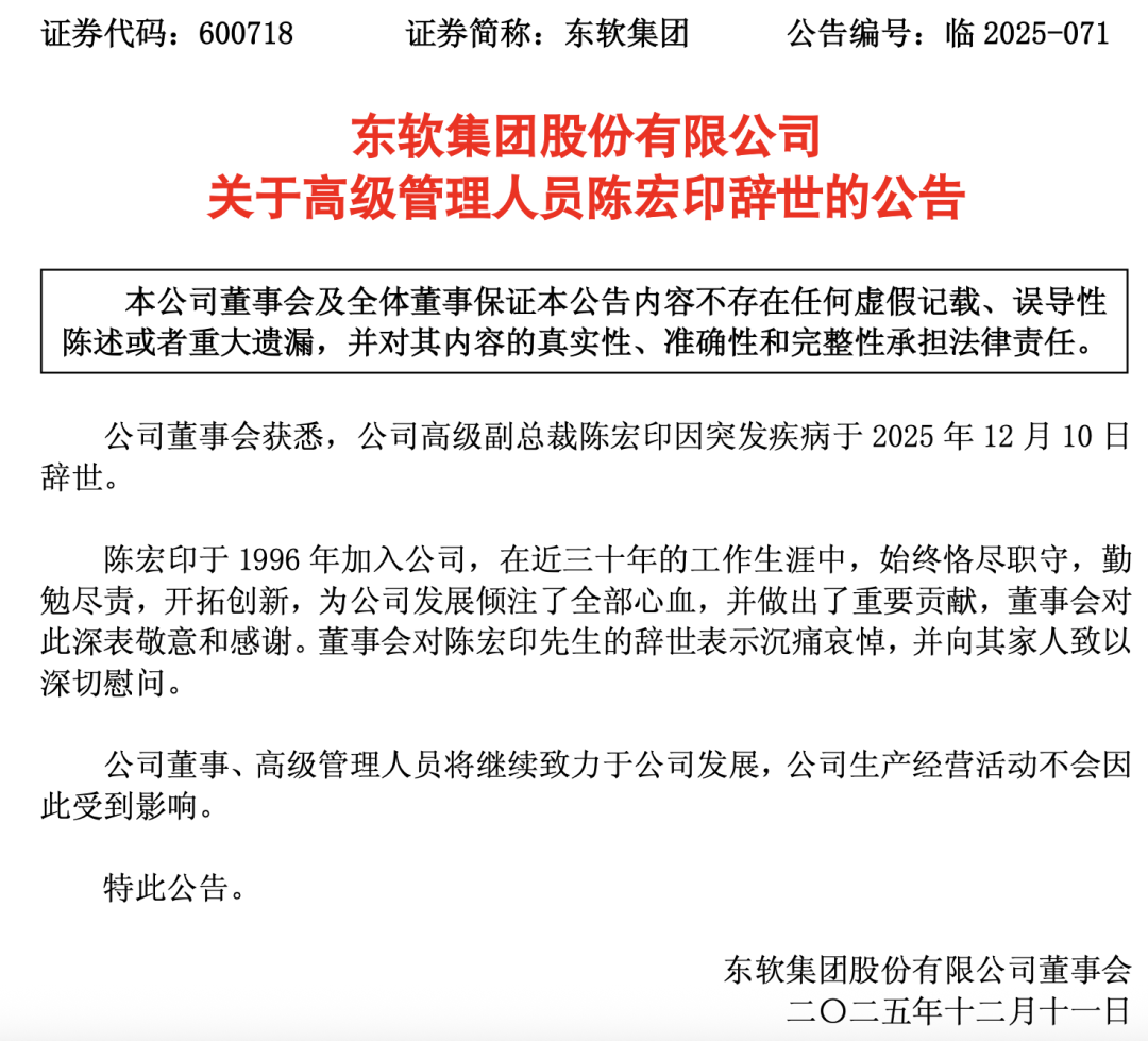每经编辑|段炼 12月11日,"中国软件第一股",A股外包软件巨头东软集团(600718.SH)公告称,公司董事会获悉,公司高级副总裁陈宏印因突发疾病于2025年12月10 日辞世。 加入东软近30年 去年年薪194.2万元 东软集团表示,陈宏印于1996年加入公司,在近三十年的工作生涯中,始终恪尽职守,勤勉尽责,开拓创新,为公司发展倾注了全部心血,并作出了重要 贡献,董事会对此深表敬意和感谢。董事会对陈宏印先生的辞世表示沉痛哀悼,并向其家人致以深切慰问。 公司董事、高级管理人员将继续致力于公司发展,公司生产经营活动不会因此受到影响。 公开资料显示,陈宏印,男,1970年出生,大连理工大学应用数学专业本科、计算机工程专业硕士。现任东软集团股份有限公司高级副总裁兼首席解决方 案官。陈宏印于1996年7月加入东软集团股份有限公司,曾于1997年起担任大连分公司副总经理,1999年起历任东软集团股份有限公司电力事业部总经 理、能源事业部总经理、能源与民航事业部总经理等职,2002年始任东软集团股份有限公司副总裁,2023年2月始任东软集团股份有限公司副CTO。2023 年7月始任高级副总裁兼首席解决方案官。 202 ...