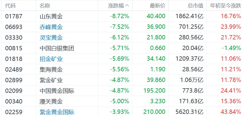 | 代码 | 名称 | 涨跌幅 ^ | 最新价 | 总市值 | 年初至今涨跌 | | --- | --- | --- | --- | --- | --- | | 01787 | 山东黄金 | -8.72% | 40.400 | 1862.41 Z | 16.76% | | 06693 | 赤峰黄金 | -7.52% | 36.900 | 701.25亿 | 23.99% | | 03330 | 灵宝黄金 | -6.12% | 21.800 | 280.56 Z | 21.72% | | 00815 | 中国白银集团 | -5.71% | 0.660 | 20.04亿 | -1.49% | | 01818 | 招类矿业 | -5.69% | 34.140 | 1209.37亿 | 11.06% | | 02489 | 集海黄金 | -5.56% | 1.190 | 28.56亿 | 11.21% | | 02899 | 紫金矿业 | -4.87% | 39.860 | 1.06万亿 | 11.78% | | 02099 | 中国黄金国际 | -4.87% | 195.200 | 773.8亿 | 24.41% ...