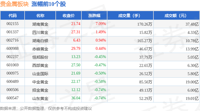 证券之星消息,10月31日贵金属板块较上一交易日上涨0.12%,湖南黄金领涨。当日上证指数报收于3954.79,下跌0.81%。深证成指报收于 13378.21,下跌1.14%。贵金属板块个股涨跌见下表: | 代码 | 名称 | 收盘价 | 涨跌幅 | 成交量(手) | 成交额(元) | | --- | --- | --- | --- | --- | --- | | 002155 | 湖南直余 | 21.74 | 7.09% | 170.26万 | 37.4812 | | 001337 | 四川黄金 | 27.31 | 1.49% | 15.82万 | 4.33 | | 002716 | 湖南白银 | 6.43 | 0.94% | 165.27万 | 10.78 | | 600988 | 赤峰黄金 | 29.79 | 0.44% | 46.67万 | 13.99 | | 002237 | 恒邦股份 | 13.23 | -0.45% | 37.79万 | 5.0512 | | eoloea | 西部黄金 | 27.50 | -0.47% | 22.65万 | 6.3012 | | 000975 | 山美国际 | ...