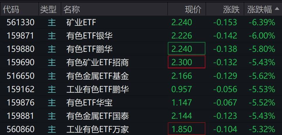 | 代码 | ਤੇ ਕੀ | 名称 | 现价 | 涨跌 | 涨跌幅 ▲ | | --- | --- | --- | --- | --- | --- | | 561330 | 士 | 矿业ETF | 2.240 | -0.153 | -6.39% | | 159871 | 主 | 有色ETF银华 | 2.226 | -0.142 | -6.00% | | 159880 | 主 | 有色ETF鹏华 | 2.240 | -0.138 | -5.80% | | 159690 | 主 | 有色矿业ETF招商 | 2.300 | -0.132 | -5.43% | | 516650 | 主 | 有色金属ETF基金 | 2.166 | -0.129 | -5.62% | | 159162 | 主 | 工业有色ETF鹏华 | 0.957 | -0.056 | -5.53% | | 159876 | 主 | 有色ETF华宇 | 1.147 | -0.067 | -5.52% | | 159881 | 主 | 有色金属ETF国泰 | 2.144 | -0.123 | -5.43% | | 560860 | | 主 工业有色ETF ...