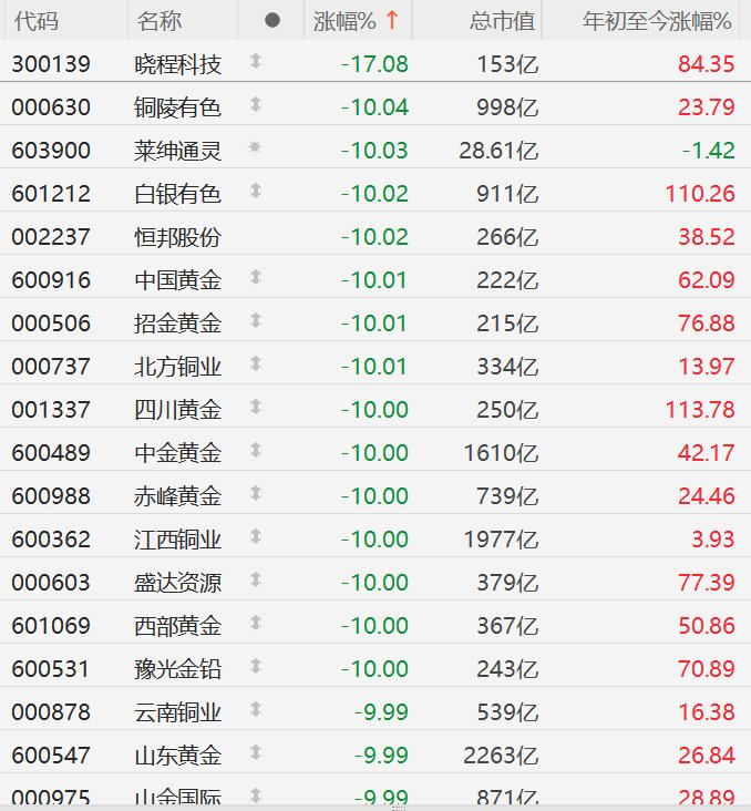 格隆汇2月2日|A股市场黄金概念股大面积跌停,其中,晓程科技跌17%,铜陵有色、莱绅通灵、白银 有色(维权)、恒邦股份、中国黄金、招金黄金、北方铜业、四川黄金、中金黄金、赤峰黄金、江西铜 业、盛达资源、西部黄金、豫光金铅、云南铜业、山东黄金、山金国际、株冶集团、湖南白银、贵研铂 业、萃华珠宝、鹏欣资源等逾20股10CM跌停。 金银价格继续回调,现货黄金今日盘中跌至4586.16美元/盎司,较上周四的5595.44美元历史高位回调 18%;现货白银今日盘中跌至76.967美元/盎司,较上周四的121.6485美元历史高位大幅回调36.7%。 | 代码 | 名称 | | 涨幅% ↑ | 总市值 | 年初至今涨幅%。 | | --- | --- | --- | --- | --- | --- | | 300139 | 晓程科技 | 1 | -17.08 | 153亿 | 84.35 | | 000630 | 铜陵有色 | 1 | -10.04 | 998亿 | 23.79 | | 603900 | 菜细通灵 | 夜 | -10.03 | 28.61 亿 | -1.42 | | 601212 | 白银有色 | 1 | ...
