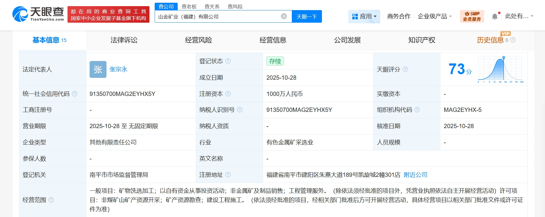松果财经讯,天眼查App显示,近日,山金矿业(福建)有限公司成立,法定代表人为张宗永,注册资本1000万人民币,经营范围为矿物洗选加工、以自有 资金从事投资活动、非金属矿及制品销售、工程管理服务、非煤矿山矿产资源开采、矿产资源勘查、建设工程施工,由山东黄金(600547)、南平武夷矿产 资源发展有限公司分别持股65%、35%。 | | 都在用的商业查询工具 | 盘公司 查老板 | | | --- | --- | --- | --- | | | 国家中小企业发展子基金旗下机构 | 山金矿业(福建) 卓限公司 | × 天眼一下 | | 基本信息 15 | 法律诉讼 | 经营风险 | 经营信息 | | 法定代表人 | के 张宗永 | 登记状态 ⑦ | 存续 | | | | 成立日期 | 2025-10-28 | | 统一社会信用代码 2 | 91350700MAG2EYHX5Y | 注册资本 ② | 1000万人民币 | | 工商注册号 | | 纳税人识别号 ② | 91350700MAG2EYHX5Y | | 营业期限 | 2025-10-28 至 无固定期限 | 纳税人资质 | | | 华小学型 | 其他有限 ...