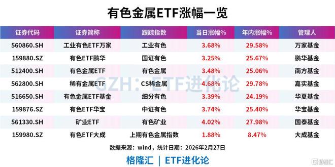 市场趋势与核心观点 - 全球市场关注点正从算力、模型、应用等下游领域,向上游的“资源”蔓延,表现为铜、铝、黄金、稀土等有色金属轮番走强,全球资金重新定价“矿山”和“资源国”[2][3][4] - 市场核心变化在于认识到AI等科技浪潮不再仅是终端品牌和芯片巨头的红利,而是一场席卷全产业链的成本再分配,上游资源国和原材料供应商的议价能力正在抬升[4][5] - 这一趋势的宏观背景是“资源民族主义”兴起,即资源国通过限制原矿出口、要求本地加工、推动本地建厂等政策手段,加强对本国自然资源的控制,以在AI、电动车、储能、光伏等新兴产业中最大化本国利益[2][4][5] 有色金属市场表现 - 有色金属板块行情凌厉,厦门钨业、中钨高新、北方稀土、东方钽业等多只个股创出历史新高[6] - 关键原材料价格大幅上涨,以钨为例,2月25日钨粉价格突破1800元/公斤,较去年初上涨469.6%,较今年初上涨66.7%;仲钨酸铵(APT)价格冲至110万元/吨,较去年初涨幅超400%[6] - 有色金属主题ETF表现强劲,多只产品年内涨幅超过25%,例如工业有色ETF万家年内涨29.58%,稀有金属ETF年内涨29.78%[6][8] 有色金属ETF资金流向与规模 - 市场共有21只有色金属类ETF,跟踪8大指数,其中20只为股票型ETF[10] - 资金正借道ETF大幅流入有色金属板块,其中规模最大的有色金属ETF(512400)最新规模为390.44亿元,年内净流入136.93亿元;有色金属ETF基金(516650)规模167.02亿元,年内吸金88.6亿元[10][11] - 其他主要ETF如工业有色ETF万家(560860)规模150.21亿元,年内净流入38.38亿元;有色ETF大成(159980)规模80.94亿元,年内净流入31.18亿元[11] 有色金属ETF行业与成分构成 - 不同主题的ETF在行业分布上各有侧重,例如有色金属ETF(512400)以铜(30.50%)、铝(15.20%)、黄金(14.75%)为主;稀有金属ETF(562800)则聚焦稀土(15.10%)、铜(14.11%)、锂(13.38%)等,不含铝和黄金[13][14] - 工业有色指数更聚焦于铜(34.67%)、铝(20.24%)和稀土(12.52%),黄金含量很低(3.72%)[13][14] - 主要ETF的重仓股高度集中于行业龙头,例如紫金矿业、洛阳钼业、北方稀土、中国铝业、华友钴业、中金黄金、山东黄金、赣锋锂业等公司在多个指数中占据前十大权重[15] 有色金属细分赛道与上涨动因 - 有色金属按用途可分为贵金属(如黄金、白银)、工业金属(如铜、铝)、能源金属(如锂、钴、镍)以及稀有金属与稀土(如钨、钼、稀土)[16][17] - 黄金上涨核心动因在于去美元化趋势强化、地缘冲突频发及全球央行持续增持储备[17] - 铜价上涨直接映射电气化时代扩张,AI数据中心、电网升级、新能源汽车增加铜的使用强度,而矿山资本开支长期不足导致新增供给释放偏慢,供需错配预期强烈[18] - 铝受益于新能源汽车、光伏和储能扩张,但供给端受能耗与环保政策约束,产能扩张受限[18] - 稀土逻辑偏向战略安全,高性能电机和军工需求抬升,叠加资源国加强出口管理,增强了其在产业链中的话语权[18] - 白银具备“双重定价”属性,一方面受贵金属情绪驱动,另一方面光伏装机扩张和AI硬件需求增长强化了其工业属性[17] 有色金属指数收益表现 - 近一年来,主要有色金属主题指数涨幅均超过120%,其中有色矿业指数涨幅最高,达140.26%,工业有色指数涨幅为135.23%[15][16] - 2026年以来(截至2月27日),各指数也录得显著涨幅,CS稀金属指数涨24.48%,中证有色指数涨24.39%,工业有色指数涨23.32%[16]