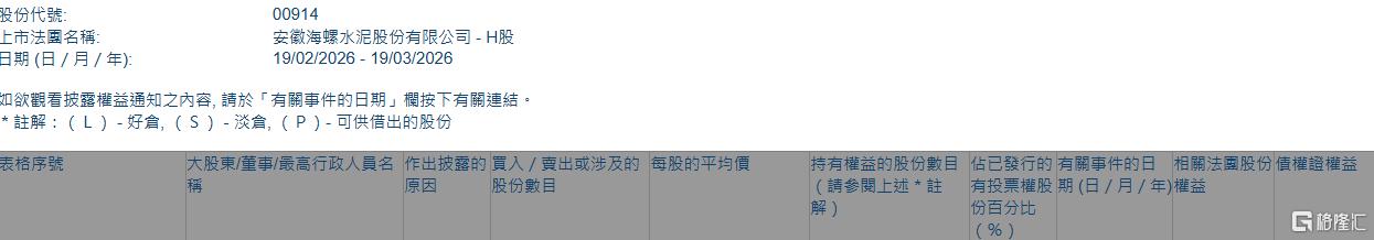 核心事件:FMR LLC增持海螺水泥H股股份 - FMR LLC于2026年3月16日在场内增持海螺水泥(00914.HK)332.25万股[1] - 增持的平均价格为每股22.7745港元,涉及总金额约7566.83万港元[1] - 此次增持后,FMR LLC的持股总数达到6617.32万股[1] 股权变动详情 - 增持后,FMR LLC对海螺水泥H股的持股比例由4.84%上升至5.09%,突破了5%的持股门槛[1] - 根据披露表格,此次权益变动日期为2026年3月16日[2] - 披露的股份数目与持股比例均标注为“长仓”(Long Position)[2]