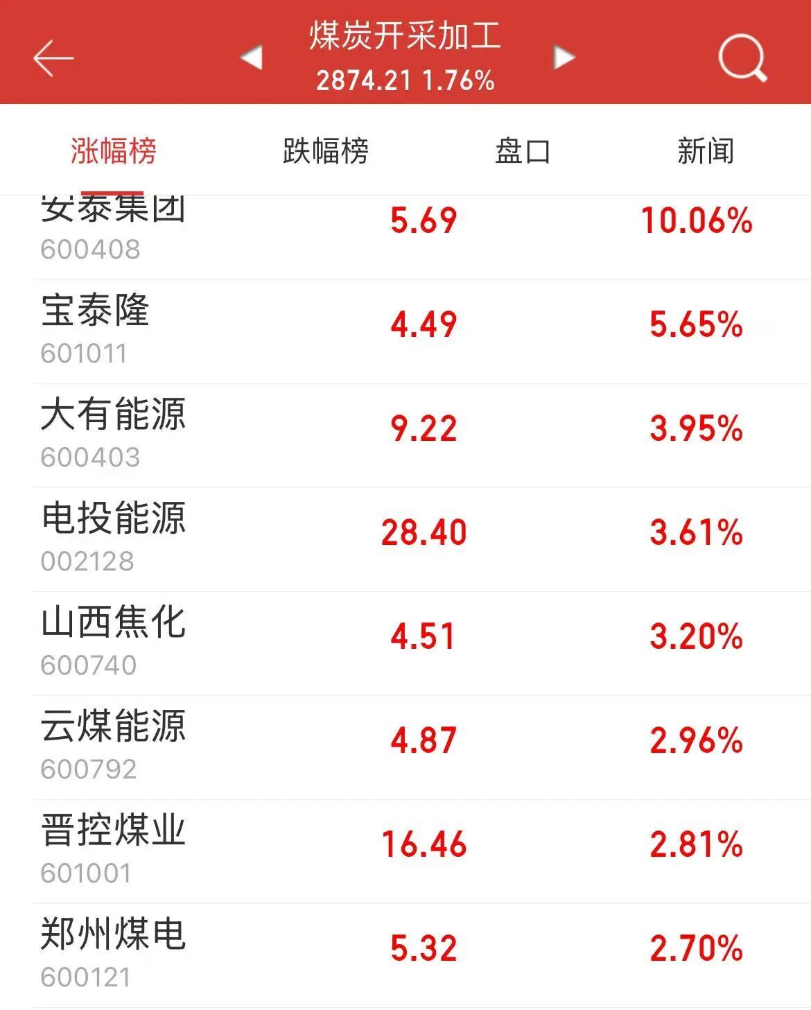 进入11月后,冷空气活动逐步频繁,北方冬季取暖已经陆续开启,动力煤价格持续走高,突破800元/吨关口,创下年内新高。 今天(11月13日),煤炭板块和冰雪旅游板块双双走强,板块内多只个股涨停。 寒潮即将来袭! 煤炭股今天又发力 今天,煤炭板块再次走强,截至收盘,安泰集团涨停,多股跟涨。 | | 煤炭开采加工 | | | | --- | --- | --- | --- | | | 2874.21 1.76% | | | | 涨幅榜 | 跌幅榜 | 盘口 | 新闻 | | 女泰票团 | 5.69 | | 10.06% | | 600408 | | | | | 宝泰隆 | 4.49 | | 5.65% | | 601011 | | | | | 大有能源 | 9.22 | | 3.95% | | 600403 | | | | | 电投能源 | 28.40 | | 3.61% | | 002128 | | | | | 山西焦化 | 4.51 | | 3.20% | | 600740 | | | | | 云煤能源 | 4.87 | | 2.96% | | 600792 | | | | | 晋控煤业 | 16.46 | | ...
