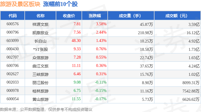 板块整体表现 - 旅游及景区板块在当日整体上涨2.42%,表现优于大盘,上证指数当日上涨0.53%,深证成指上涨0.18% [1] - 板块内个股普遍上涨,领涨股为三峡旅游,涨幅达5.20% [1] - 板块整体资金流向显示主力资金净流入5334.72万元,而游资资金净流出5504.02万元,散户资金净流入169.3万元 [1] 领涨个股表现 - 三峡旅游收盘价为6.47元,成交量36.70万手,成交额2.33亿元,主力资金净流入2215.79万元,主力净占比9.51% [1][2] - 大连圣亚涨幅4.88%,收盘价50.76元,成交量18.23万手,成交额8.89亿元 [1] - *ST张股涨幅4.63%,收盘价8.82元,成交量18.83万手,成交额1.63亿元,主力资金净流入1570.83万元,主力净占比9.65% [1][2] 其他涨幅居前个股 - 祥源文旅涨幅4.58%,收盘价7.53元,成交量29.09万手,成交额2.17亿元,主力资金净流入2437.95万元,主力净占比11.25% [1][2] - 九华旅游涨幅3.81%,收盘价36.75元,成交量4.31万手,成交额1.56亿元,主力资金净流入3334.44万元,主力净占比21.41% [1][2] - 云南旅游涨幅2.93%,收盘价5.62元,成交量50.04万手,成交额2.79亿元,主力资金净流入808.12万元 [1][2] 个股资金流向详情 - 宋城演艺主力资金净流出3345.30万元,主力净占比-7.81%,游资和散户资金也呈净流出状态 [2] - 天府文旅主力资金净流入3023.90万元,主力净占比8.44% [2] - 峨眉山A主力资金净流入929.26万元,主力净占比5.39% [2] - 西安旅游主力资金净流出296.59万元,但游资资金净流入658.73万元 [2]