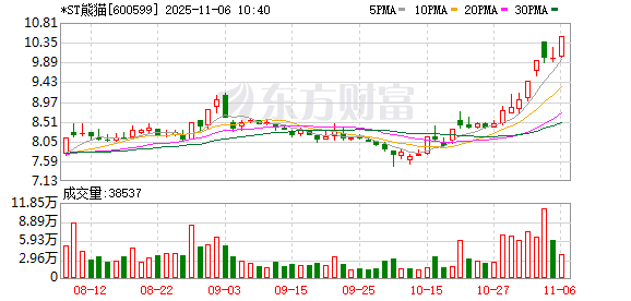 *ST熊猫再度涨停,5个交易日内录得3个涨停,累计涨幅为16.32%,累计换手率为20.67%。截至9:54, 该股今日成交量347.44万股,成交金额3559.94万元,换手率2.09%。最新A股总市值达17.40亿元。 龙虎榜数据显示,该股因连续三个交易日内,收盘价涨幅偏离值累计达到12%的ST证券、*ST证券上榜 龙虎榜1次,买卖居前营业部中,营业部席位合计净买入85.02万元。 (文章来源:证券时报网) 据天眼查APP显示,熊猫金控股份有限公司成立于1999年12月12日,注册资本16600万人民币。(数据 宝) 近日该股表现 | 日期 | 当日涨跌幅(%) | 换手率(%) | 主力资金净流入(万元) | | --- | --- | --- | --- | | 2025.11.05 | -0.10 | 3.64 | -16.16 | | 2025.11.04 | 0.60 | 6.63 | -847.60 | | 2025.11.03 | 4.97 | 3.88 | 585.78 | | 2025.10.31 | 4.99 | 4.43 | 1247.97 | | 2025.10.30 | 1.81 ...