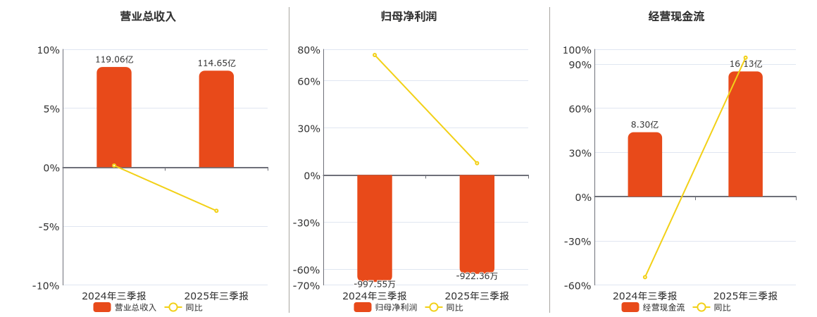 公司2025年第三季度财务表现 - 第三季度实现营业收入32.41亿元,同比下降7.78% [1] - 第三季度归属于上市公司股东的净利润亏损8405.07万元 [1] - 第三季度基本每股收益为-0.05元 [1] 公司2025年前三季度累计财务表现 - 前三季度累计实现营业收入114.65亿元,同比下降3.70% [1] - 前三季度累计归属于上市公司股东的净利润亏损922.36万元 [1] - 前三季度累计基本每股收益为-0.01元 [1]